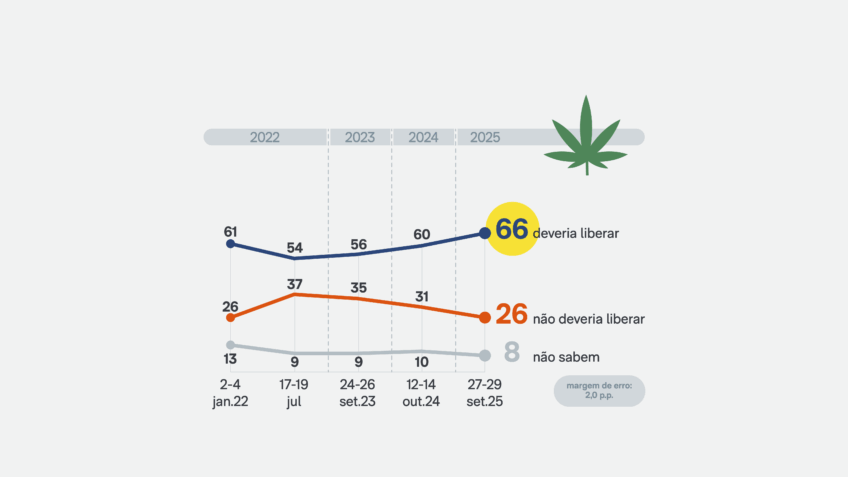 O apoio à liberação da maconha para uso medicinal no Brasil atingiu a maior taxa registrada pelo PoderData desde o início da série histórica, em janeiro de 2022. Agora, 66% dos eleitores afirmam apoiar a liberação. A taxa dos que declaram ser contra a liberação oscilou 5 pontos percentuais para baixo e hoje é de 26%. Os dados são de pesquisa PoderData feita de 27 a 29 de setembro de 2025.