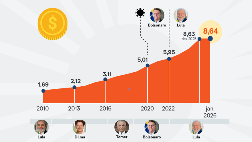 A DPF (Dívida Pública Federal) subiu de R$ 8,635 trilhões em dezembro para R$ 8,641 trilhões em janeiro. A alta foi de 0,07% no período. O Tesouro Nacional divulgou o Relatório Mensal da Dívida nesta 4ª feira (25.fev.2026). Eis a íntegra da apresentação (PDF – 891 kB) e do documento (PDF – 1 MB).