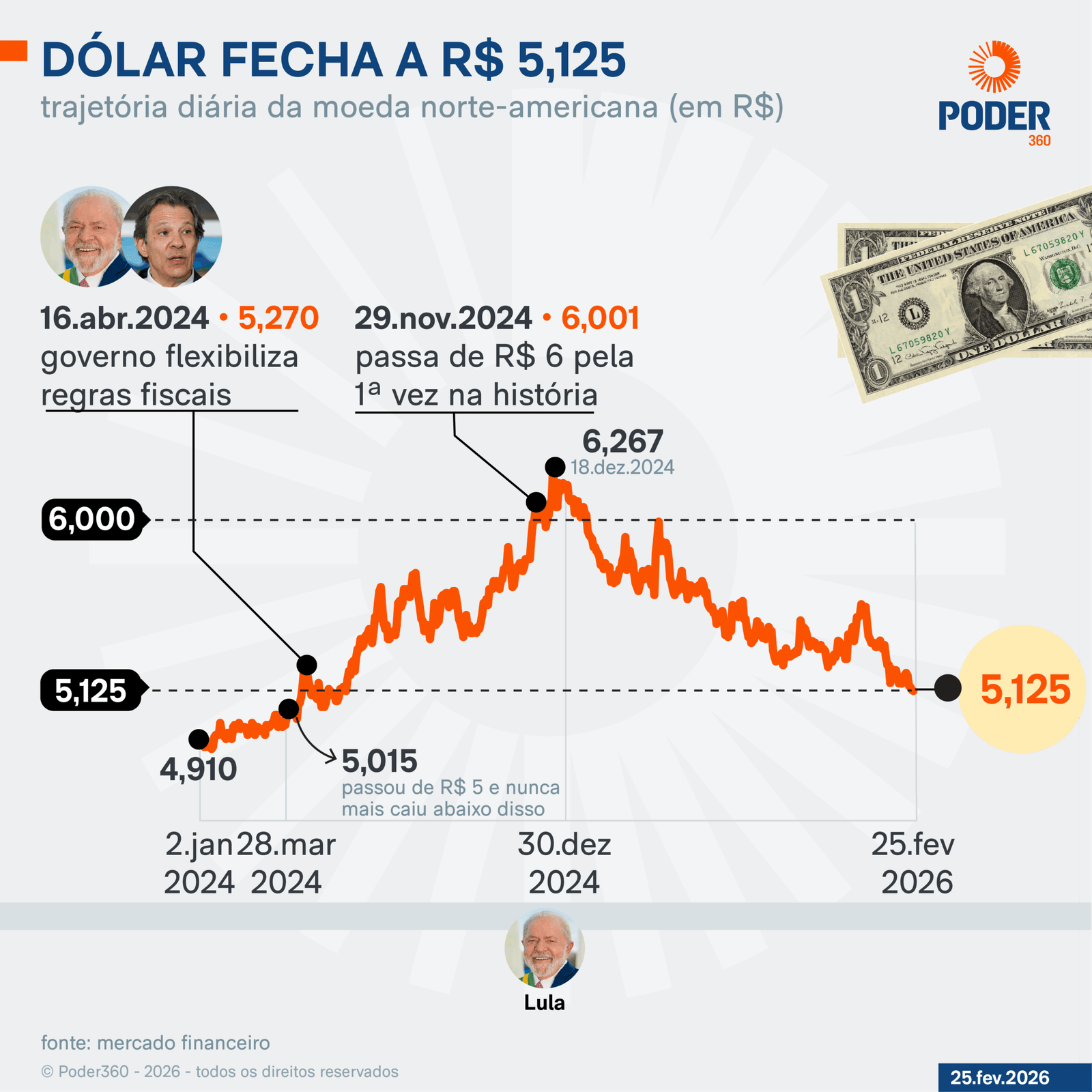 O dólar comercial encerrou o pregão desta 4ª feira (25.fev.2026) cotado em R$ 5,125, queda de aproximadamente 0,60% no fechamento em relação ao dia anterior, pressionado pelo maior apetite por risco e fluxo de capital estrangeiro no mercado brasileiro.
