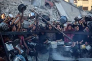 4 de 6 Uma organização de caridade distribuiu alimentos para palestinos que enfrentam sérias dificuldades no acesso a necessidades básicas devido ao bloqueio e às operações militares contínuas de Israel na Faixa de Gaza, em 24 de julho de 2025 Ali Jadallah/Anadolu via Getty Images