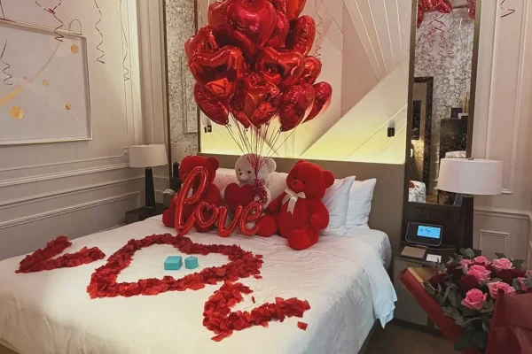 Para o pedido, o jogador preparou uma surpresa e decorou uma cama com balões vermelhos e ursinhos. No meio, desenhou um coração com pétalas de rosas vermelhas e deixou uma caixa com um presentes.
